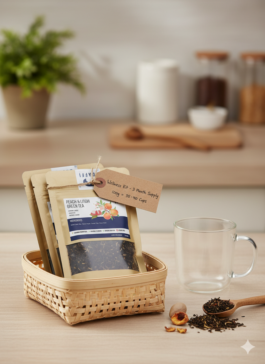 The Skin Glow Kit supports radiant skin vitality with 4 pouches of peach and litchi green tea carefully blended with antioxidant-rich fruits and vitamin C. This premium, sugar-free tea blend encourages healthy skin appearance as part of daily wellness routines. Each 100g pouch yields over 32 cups to help promote hydration, natural collagen support, and antioxidant defense. Crafted with Himalayan herbs and no artificial flavors, it supports your beauty journey without medical claims or promises.